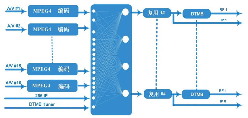 DX3526SA 16路标清编码调制一体机是我公司*研发的高集成度的标清编码调制设备。该设备支持16路CVBS输入(复合视频和非平衡立体声音频)、1路DTMB输入、支持MPEG-4 AVC/H.264编码,节目复用成8路MPTS输出。支持1个百兆/千兆IP输入/输出口。该设备支持OSD功能,可在每路编码视频中插入图片、二维码、文字等信息,具有高集成度、高性能、低成本的特点,单台设备集成了一套前端系统功能,非常适用于酒店、会所、医院、浴场等IPTV电视系统。